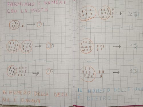 - Attività: fate colorare la pasta con i pennarelli di colori diversi (10 per colore). Dividete i bambini in coppie a piccoli gruppi e distribuite il materiale. Spiegate che devono formare delle collane di pasta, ogni collana può essere formata da 10 pezzi di pasta. Ogni collana rappresenta una decina, mentre i pezzi sparsi sono le unità. Fate formare diversi numeri. Potete anche far costruire e confrontare collane di diverse lunghezze: da 10 (1 colore), 20 (2 colori), 30 (3 colori) fino al 90 (9 colori); in questo modo i bambini hanno la possibilità di confrontare e visualizzare la grandezza dei numeri. La collana diventa un “regolo” flessibile. Il bambino può vedere che 30 pezzi di pasta sono “3 gruppi di colori diversi”.