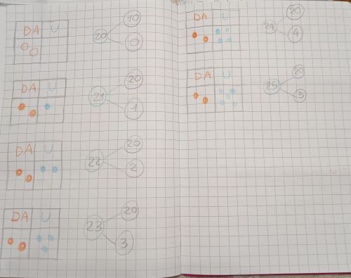 Aiutate i bambini a riflettere con queste domande: “Quante cannucce ci sono nel mazzetto?. E quanti mazzetti sono?”. Questo aiuta a capire che 1 DA = 10 U.