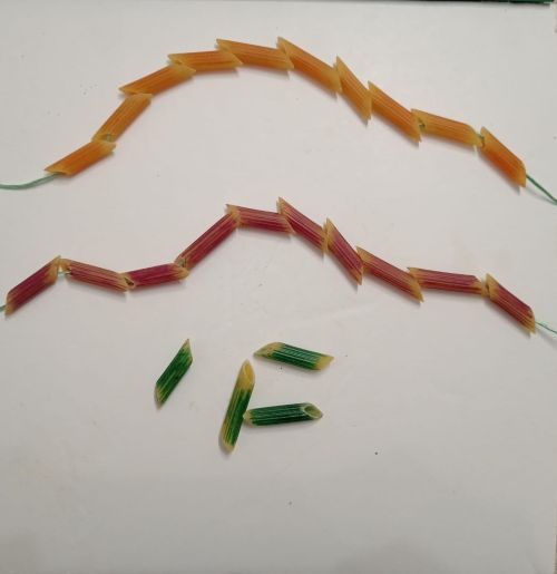È un ottimo esercizio di motricità fine associato al calcolo. La pasta potrà poi essere riutilizzata per costruire dei ritmi o delle collane da indossare.