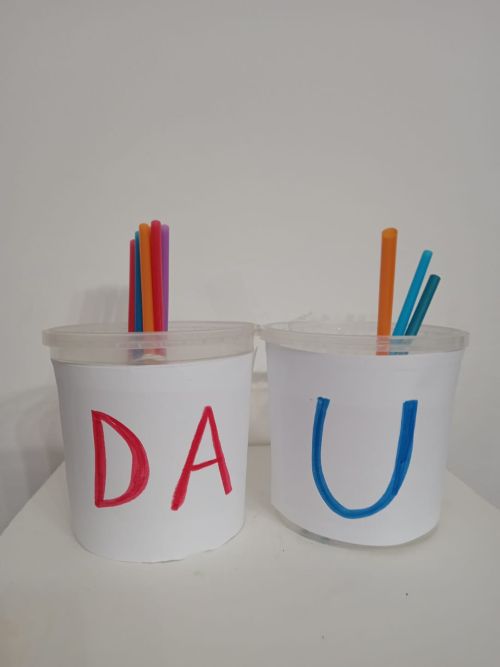 - Attività: dite un numero al bambino (ad esempio, 14) e chiedetegli di rappresentarlo con le cannucce. Il bambino dovrà prendere un mazzetto (la decina) e metterlo nel contenitore delle DA. Dovrà poi prendere 4 cannucce sciolte e metterle nel contenitore delle U.